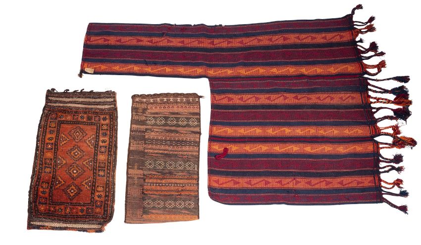 A Turkoman grain bag, the brick red field with four stepped lozenge medallions, enclosed by a panel border, 102cm x 52cm, a Turkoman grain bag with striped geometric designs and a Kurdish horse rug with puce, indigo and orange striped bands (3).