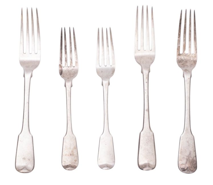 A mixed group of silver Fiddle pattern fork, various dates and makers, engraved crest and motto 'Free for a Blast' Clark family crest, 309gms., (9.9ozs.), gross, (5)
