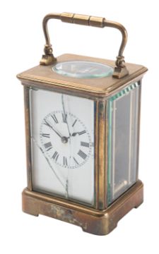 Richard et Cie, Paris, a brass carriage clock timepiece the eight-day duration movement having a silvered platform lever escapement with the backplate stamped with the R&C serpent trademark for Richard et Cie of Paris and numbered 26, the white enamel dial having black Roman numerals and blued-steel spade hands, the brass Corniche case with matching three-bale handle, height 16.5cm/13.5cm handle up/down.