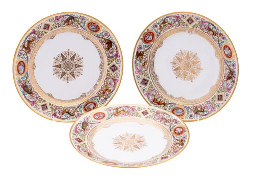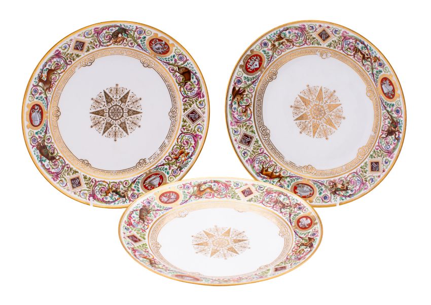 A set of three Louis-Philippe Sèvres 'Fontainebleau' plates dated 1839 and 1840 each with central gilt star roundel, the rims with 'LP' monograms and trophies reserved on a ground of beasts hunting amongst ornate scrolling foliage in the Renaissance style, blue printed factory marks dated 1839 and 1840 [2] with iron-red Chateau de Fontainebleau marks, 24cm [one with small chip to foot rim and glaze scratch to underside, minor stacking wear to gilt border around the wells] 3. Notes: The service was commissioned by King Louis-Philippe for the Chateau de Fontainebleau in 1836 with deliveries in 1839 and continued through the 1840s.