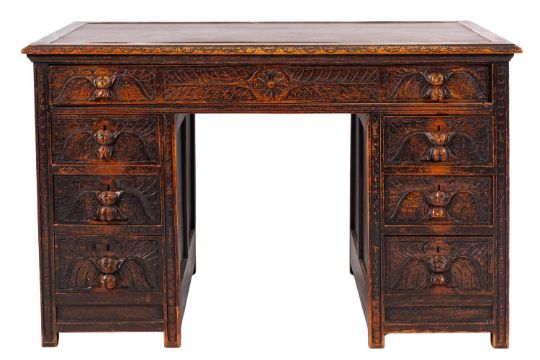 A late 19th Century carved dark oak kneehole desk, the rectangular top with inset simulated leather panel and incised edge, containing a single long frieze and six short drawers with carved and incised foliate ornament, on block feet, the top 122cm x 76cm, 77cm height.