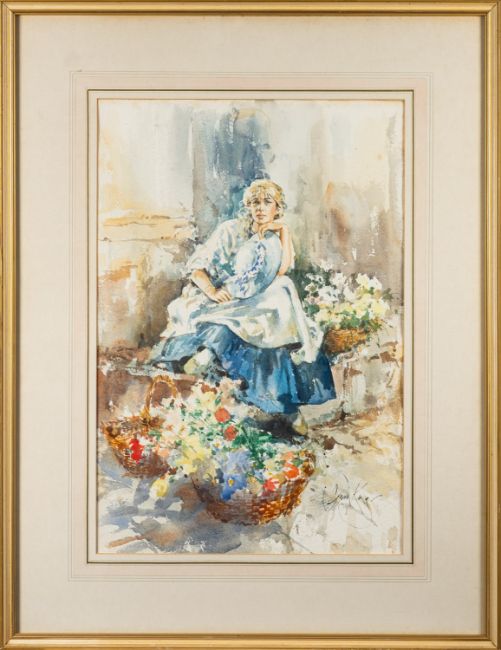 Gordon King (British, 1939-2022) - The flower girl - Watercolour - 55 x 36.6cm, 78.5 x 60.5cm framed - Signed lower right. Provenance; The Maine Gallery, Kingsbridge.