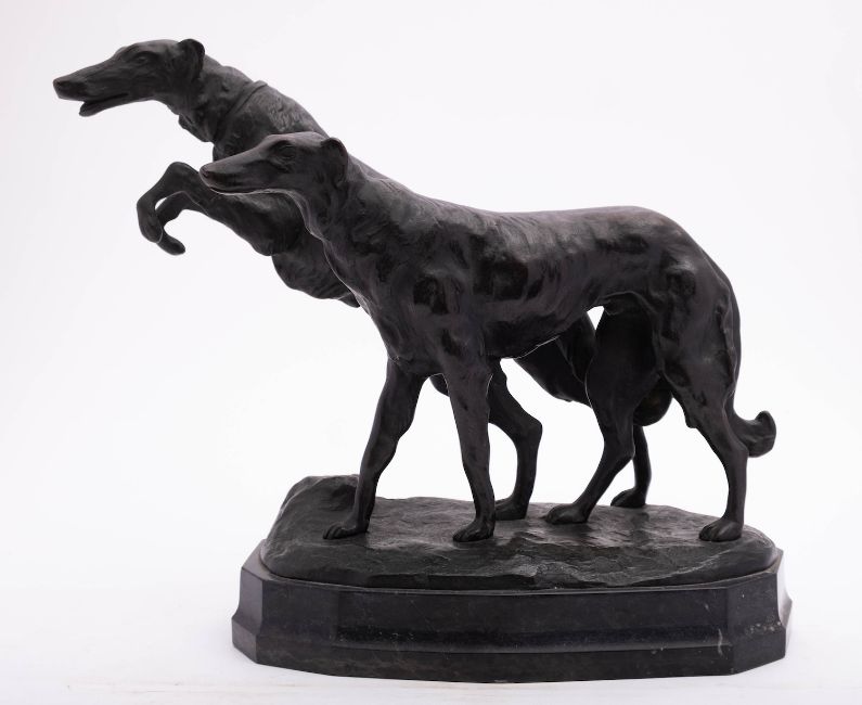 *Rudolf Kaesbach (German, 1873-1955), Zwei Barsois, (Two Borzois); a patinated bronze group; the naturalistically cast loosely oval base signed in the maquette, atop a faceted and spreading marble socle; 36cm high, 41cm long