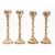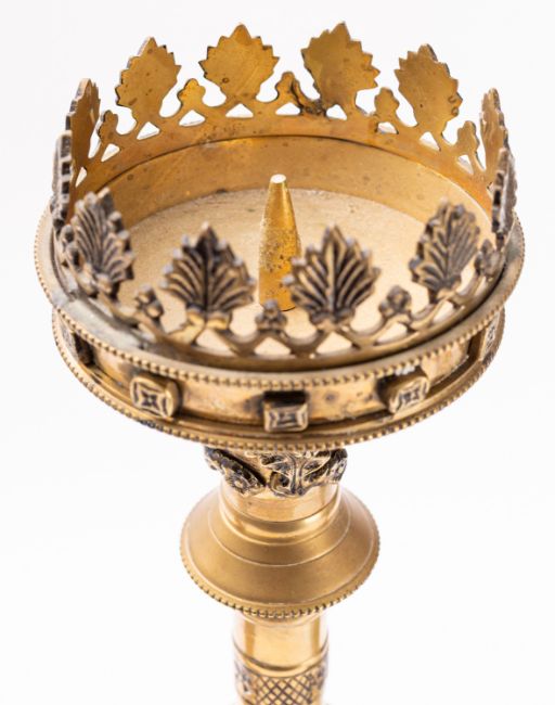 Two pairs of brass altar pricket candlesticks in Gothic taste, 20th century; all with foliate crenelations and knopped shafts to spreading bases; 50.5 and 49cm high respectively