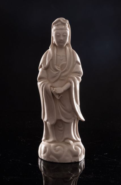 A Chinese Dehua figure of Guanyin, Qing Dynasty the deity wearing flowing robes and on cloud base, 18th/19th century, 23cm [losses to fingers, firing cracks to base].