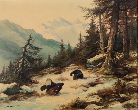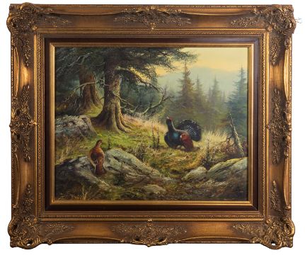 Continental School, 20th Century - Capercaillie and Grouse - A pair of oils on canvas - each 39 x 48.5cm, 57 x 67cm framed - Both indistinctly signed. (2)