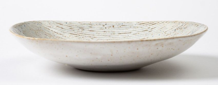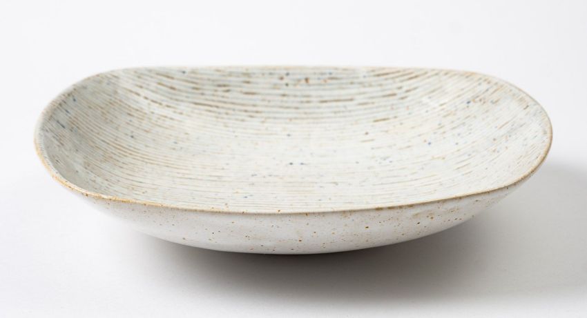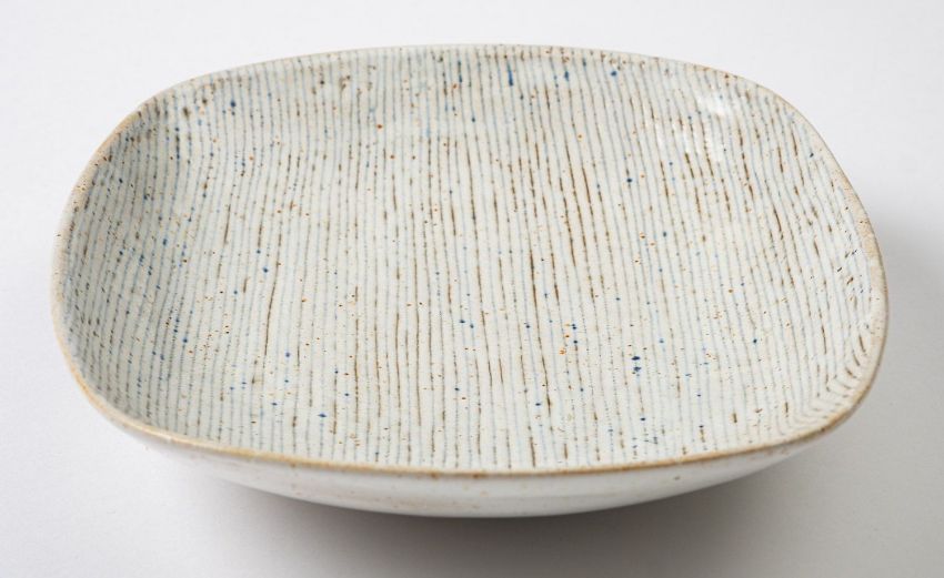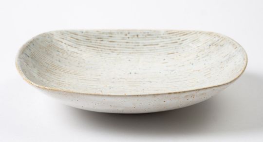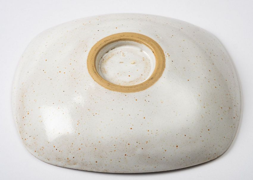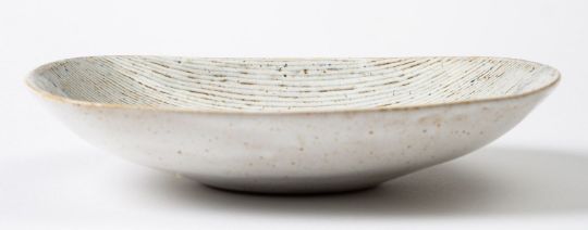 *Dame Lucie Rie DBE [1902-1995] a stoneware dish, of rounded rectangular form the white, blue and red spotted body with sgraffito decoration, impressed personal seal, 23cm long.