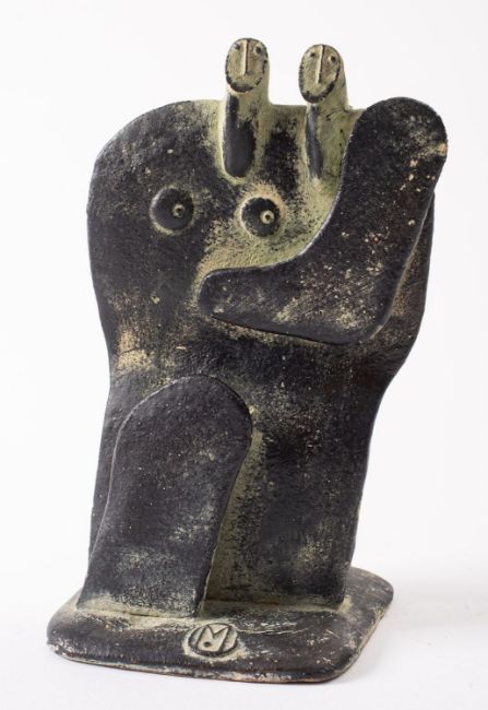 *John Maltby [1936 - 2020] stoneware group, Seated couple embracing, under matt black with pale green stainings, applied personal seal to base, 19cm high.
