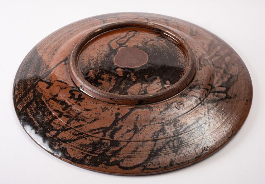 A large stoneware charger, with lustrous mustard glazes with finger trailed decoration, impressed Wenford Bridge seals to underside and foot rim, 41.5cm diameter, [glaze filled firing crack].