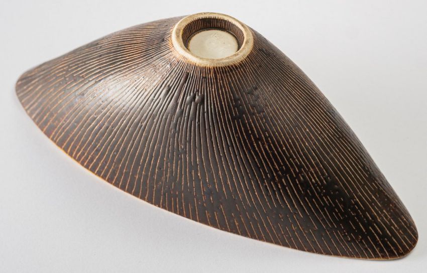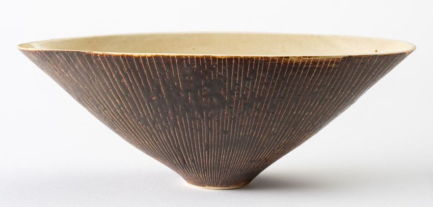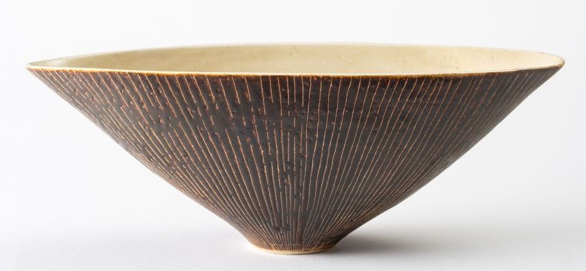 *Dame Lucie Rie DBE [1902-1995] a white stoneware bowl, of elliptical form the pitted manganese exterior with sgraffito decoration and off white interior, impressed personal seal, 30cm long.[restored]