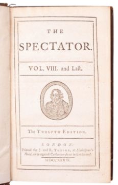 THE SPECTATOR. [ADDISON, Joseph & STEELE, Richard (eds.)]. The Twelfth Edition, 8 vols., London: Printed for J. and R. Tonson, 1739, titles with wood-engr. vignettes, wood-engr. headpieces and initials, lacking some ffeps, uniformly bound in contemp. speckled calf, gilt to spines, some cracking to joints, labels chipped or lacking, 12mo; together with... IDEM. The Spectator, Glasgow: 1750, contemp. ink ownership inscriptions to titles, a damaged set (incl. vol. 1 corners nibbled and lacking all after 324, vol. 4 all before 27 lacking or damaged), contemp. mottled calf scuffed, cracking to joints, 12mo. (16)