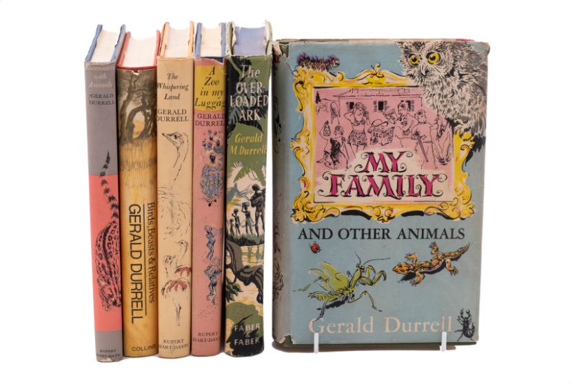 DURRELL, Gerald. Six 1st editions: The Overloaded Ark, London: Faber and Faber, 1953, ink ownership inscription to fep, toning to endpapers, dj unclipped (edgewear, small edge-tears), orig. green cloth (rubbed, frayed spots, upper board bowed), t.e.blue, 8vo; My Family and Other Animals, London: Rupert Hart-Davis, 1956, toning to endpapers, dj clipped (chips, tears, ink initials to front flap), orig. green cloth, t.e.green, 8vo; Encounter with Animals, ibid, 1958, toning to endpapers, dj unclipped, orig. blue cloth, 8vo; A Zoo in my Luggage, ibid, 1960, dj unclipped (edgewear, small edge-tears), toning to endpapers, orig. blue cloth, 8vo; The Whispering Land, ibid, 1961, dj unclipped, orig. orange cloth, 8vo; Birds, Beasts and Relatives, London: Collins, 1969, light spotting to endpapers, dj unclipped (some spotting), orig. red/orange cloth, 8vo. (6)