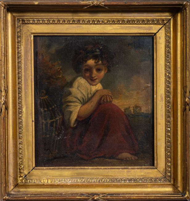 19th Century British school - Portrait study of a child set in a landscape -Oil on canvas laid on panel - 24 x 20cm, 37 x 35cm framed - Unsigned.