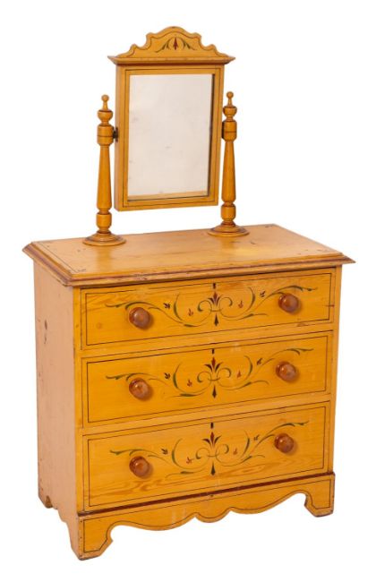 A Victorian painted wood dressing chest and mirror, late 19th century; with angle adjustable rectangular mirror with stylised pediment, in twin turned supports; the chest with moulded top edges above three drawers, decorated overall with stylised foliate arabesques; 143cm high overall, 84cm wide, 48cm deep