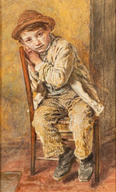 William Henry Hunt (British, 1790-1864) - Boy seated on a chair -Watercolour on paper - 30 x 18.5cm, 47 x 25cm framed - Signed 'W Hunt' lower left, with Messrs Gooden & Fox label verso.