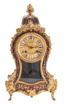 Japy Frères, Paris a tortoiseshell boulle mantel clock the eight-day duration movement striking the hours and half-hours on a bell and stamped with the trademark of the maker of the blanc roulant Japy Frères of Paris along with the serial number 1064 and retailer's name Rollin, Paris, the pendulum with a cast-brass engraved bob, the decorative ormolu dial having porcelain plaques with blue Roman hour numerals and fleur-de-lys blued-steel hands, the waisted boulle red tortoiseshell case with c-scroll and floral brass inlay and with a glazed front door, cast-brass ormolu mounts and feet all surmounted with a cast floral finial, height 30cm.