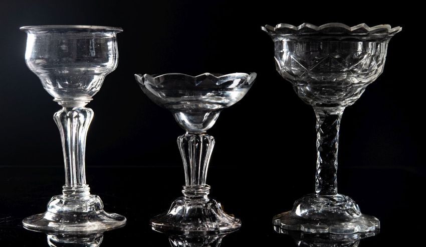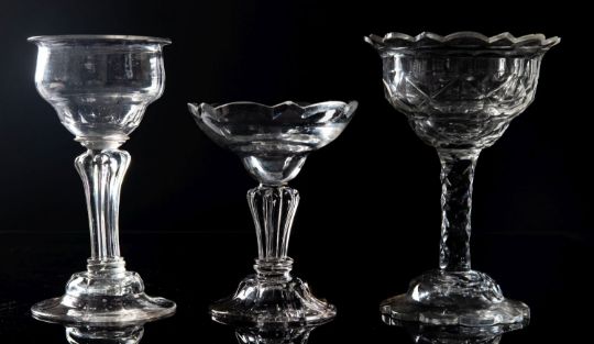 An English sweetmeat glass and two others the former with panel moulded ogee bowl with everted rim set on an eight sided pedestal stem between collars on a panel and domed foot, 18cm high, circa 1745, [minor chips] together with a similar example, 14cm high [rim reduced], together with another the ogee bowl with petal shaped rim and cut decoration on a faceted stem on a domed petal shaped foot, 18cm high, circa 1790. [chips]