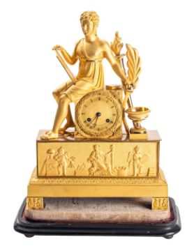 A French Empire ormolu mantel clock having an eight-day duration movement with silk-suspension striking the hours and half-hours on a bell with an outside countwheel, the gilded dial having black Roman numerals and blued-steel moon hands with the gilt-brass case having a frieze of classical figures to the front, urns to the sides and surmounted by a classical figure depicting a scholar reading, on an rectangular ebonised base, height 39cm, 44cm including base.