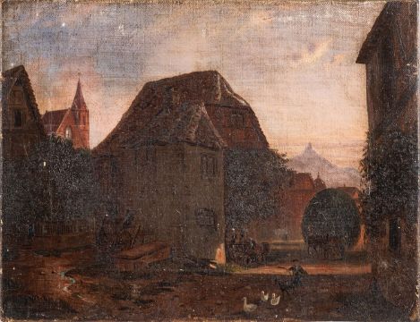 19th Century continental school - A Flemish town scene - Oil on canvas - 24 x 31cm, unframed -Indistinctly signed and dated 1874 lower right.