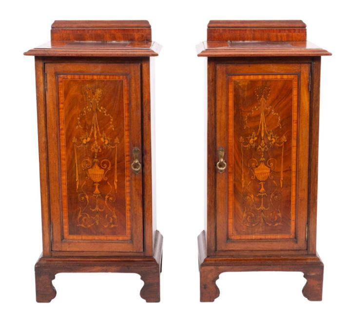 A pair of Edwardian mahogany and marquetry bedside cupboards, early 20th century; each with raised back edge with moulded top and ogee moulded front and side edges; the opposing doors with Neoclassical style urns amongst beribboned swags and foliate grotesques; raised on bracket feet; (adapted); 82cm high, 39cm wide, 33cm deep