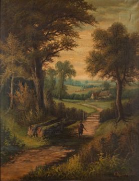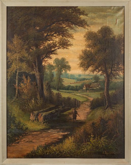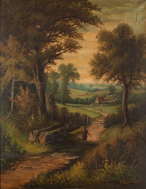E. Mazzoni (late 19th Century) - Figure walking along a wooded path -Oil on canvas - 89.5 x 69cm, 97.5 x 78cm framed - Signed and dated 'E Mazzoni 1890' lower right.