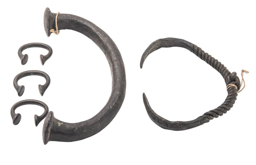 Three copper alloy manilla currency 'bangles', West Africa, 19th century, 6cm wide; a larger object similar, possible also a manilla, 28cm wide; and a twisted bronze example, also West African, 20cm wide