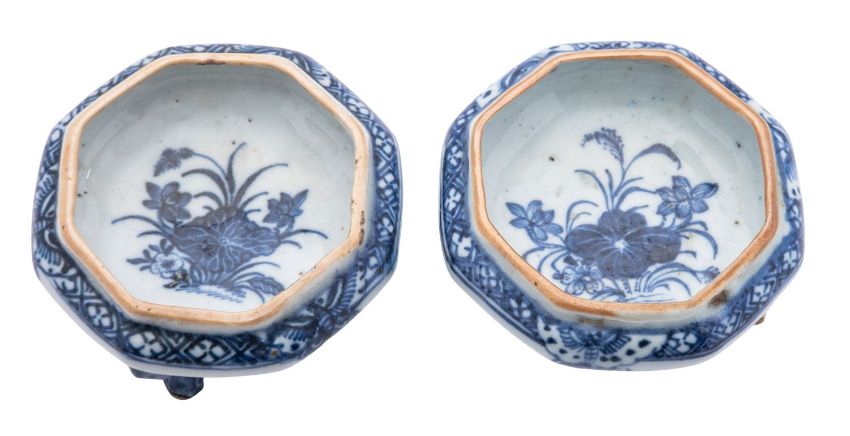 A pair of Chinese blue and white octagonal tripod salts, Qianlong painted with a large lotus spray to the interior, the exterior rim with a butterfly and diaper band, 8cm [one damaged].