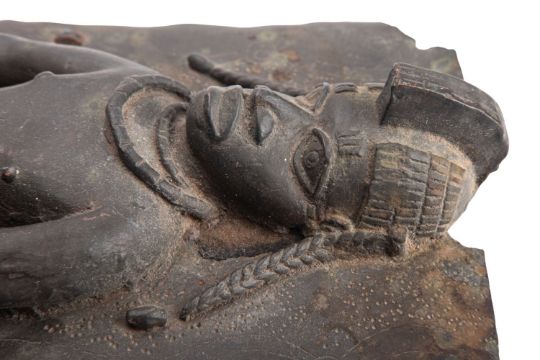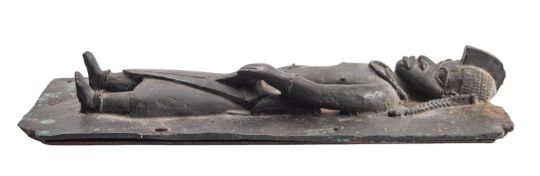 A copper alloy figural relief panel in the style of 16th century Benin examples of West Africa, possibly later; the figure portrayed standing and looking straight out, his plaited hair falling to his shoulders, bare-chested above traditional attire; the rectangular backplate with engraved decoration; mounted onto a later wood backplate; 42 x 20cm
