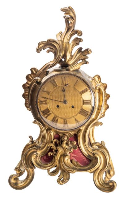 A substantial French Victorian ormolu mantel clock the eight-day duration movement having a silk suspension and striking the hours and half-hours on a bell with an outside countwheel, the gilded dial having engine-turned decoration, raised gilt Roman numerals, blued-steel moon hands and a regulation lever above XII o'clock, the ormolu case of waisted form with c-scroll mounts, height 61cm.