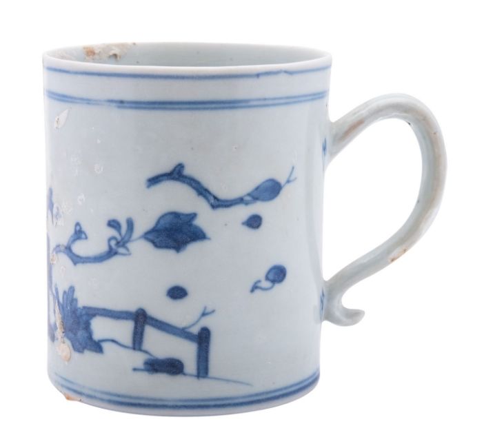 A Chinese 'Nanking Cargo' cylindrical mug, Qianlong with grooved scroll handle, painted in the 'Peony' pattern, 10cm [some encrustation]Provenance: Christie's Amsterdam 28th April-2nd May 1986, part lot 1669.
