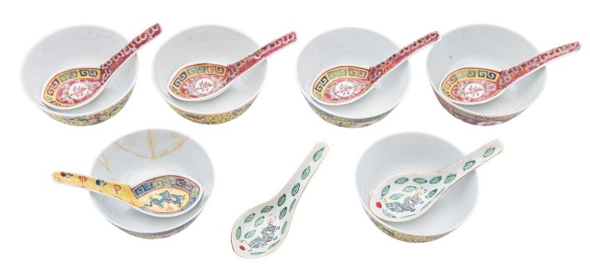 A group of six Chinese Stanley of Hong Kong yellow and ruby ground bowls and seven spoons, mid 20th century decorated with longevity symbols and scrolling lotus, stamped marks [one bowl with glue repairs 13.