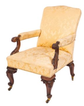 An early Victorian carved walnut and later Damask fabric upholstered library armchair, mid 19th century; the rectangular back with shallow arched top, above padded arms with channeled and scrolled terminals; the cabriole legs descending from scrollworked cabochons at the knees, to scrolled feet, on brass castors; 100cm high, 66cm wide