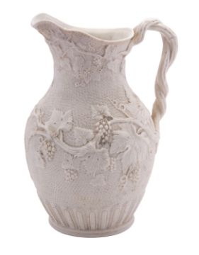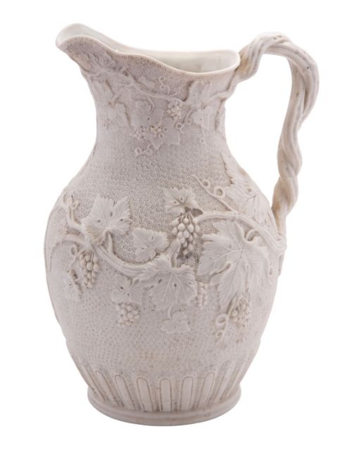 A 19th century Parian vine pattern jug with entwined vine branch handle and moulded in relief with fruiting vines, 25cm.