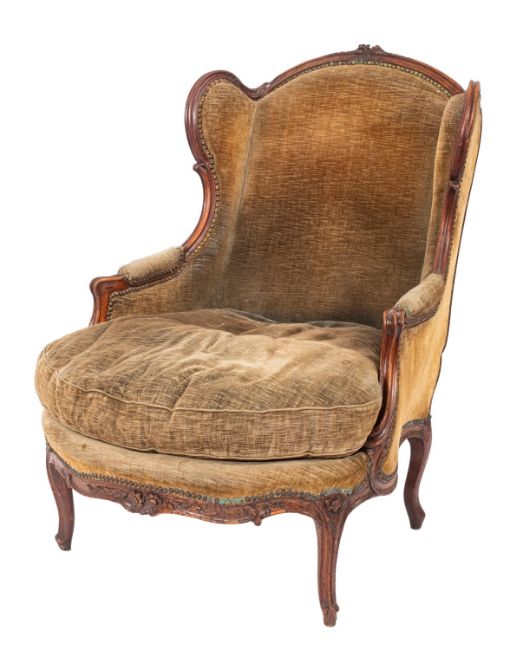 A Continental walnut and upholstered wing armchair in mid 18th century taste, circa 1900; the channeled show frame with foliate carved arched top to the backrest; with brass studded green upholstery throughout; on serpentine rails and with cabriole feet; 108cm high, 80cm wide, 92cm overall depth