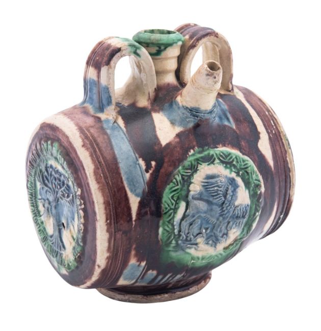 A French pottery 'pilgrim' flask, probably Saintonge, late 17th century of barrel shape, decorated in the Palissy style with blue, green and brown glazes, a moulded medallion to one end and another below the spout, 17cm high [a small hole to one end, minor glaze losses].