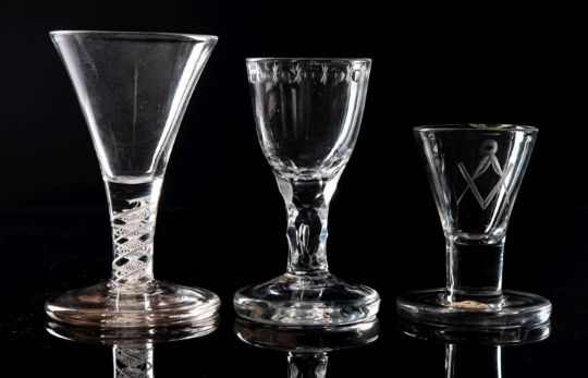 Three English firing glasses one with trumpet shaped bowl on a short single series opaque twist stem and heavy foot, 12cm high, circa 1770, another with round funnel shaped bowl cut with printies beneath the rim set on a short faceted stem with central tear on a heavy foot, 10cm high, circa 1790 and a later example with trumpet shaped bowl engraved with a Masonic square and dividers on a rudimentary stem and heavy foot, 8.5cm high, [glued rim chip].