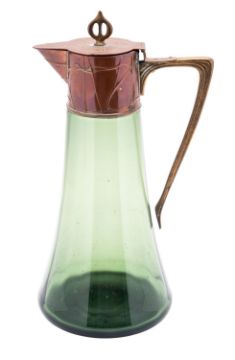 An Art Nouveau green glass claret jug of tapering form with embossed copper mounts and cover and brass handles, 28cm high.