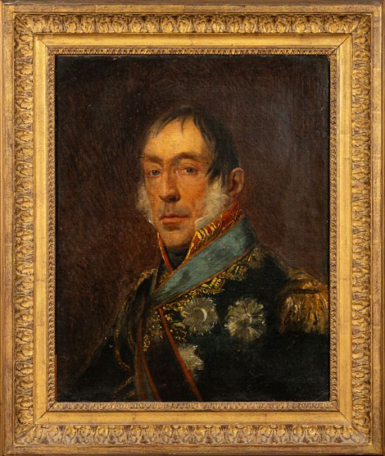 19th century European school circa 1820, in the manner of George Dawe (British, 1781-1829) -Portrait of a decorated gentleman in military uniform, possibly a Russian officer -Oil on canvas -61.5 x 49cm, 81 x 68.5cm framed -A Christie's barcode label verso, a Stad Gent label verso printed 'Franse of Spaans school' (French or Spanish school).