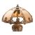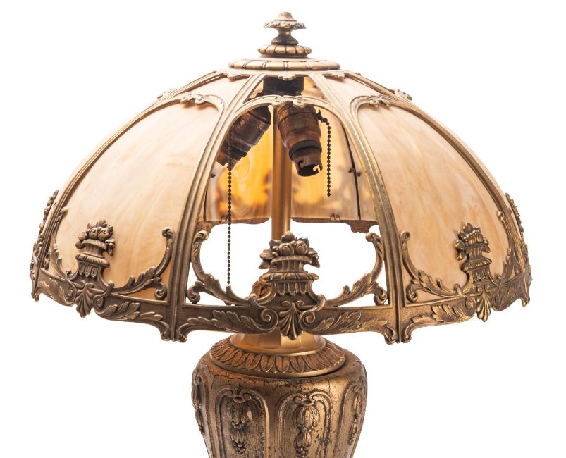 A gilt metal and marbled ochre glass table lamp, early 20th century; the domed shade formed of individual panes held within strapworked and scrolling foliate frames; the three electrical fitments above a baluster vase with stylised foliate mouldings in relief, on a square base; 57cm high, 48cm wide; (old damages)
