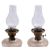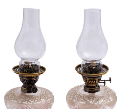 A pair of Victorian silver plated metal and glass table oil lamps, basically 19th century and adapted; with later flues and crimped pink glass shades on Sherwoods Ltd burners; set into hobnail cut and swagged bulbous reservoirs; on urn topped candlesticks stems with circular bases; 53cm high overall
