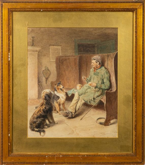 Stephen T Dadd (act 1879-1914) -A shared meal by the fireside, shepherd and his working dogs -Watercolour on paper -36 x 29 cm, 54 x 48cm framed - Signed and dated 1900 lower right.