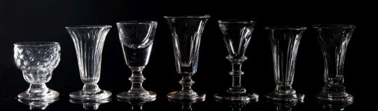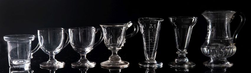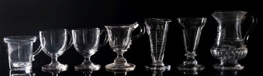 A mixed group of glass jellies, custard cups, a pair of punch cups, a medicine measure, deception glass, penny lick and a small jug of baluster form with basal flutes, inset with a silver coin with trailed decoration, [handle glued].