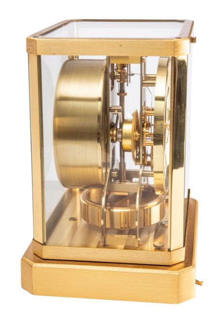 Jaeger-LeCoulte Atmos mantel clock the movement stamped to the front Atmos, Jaeger-LeCoultre, Swiss,, with the round white chapter ring having raised Roman and baton numerals and dauphine hands and signed Jaeger-LeCoultre Atmos, the escapement stamped to the top with the serial number 266106, the glazed gilt-brass case signed to the underside with a repeat signature and calibre number 528-8, height 23.5cms. With original case and booklet marked Atmos VIII.