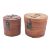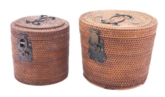 Two Chinese Canton famille rose porcelain teapots and covers in original padded wicker cases, late Qing/20th century enamelled in traditional style with figures, birds, flowers and foliage, 12 and 14cm high.