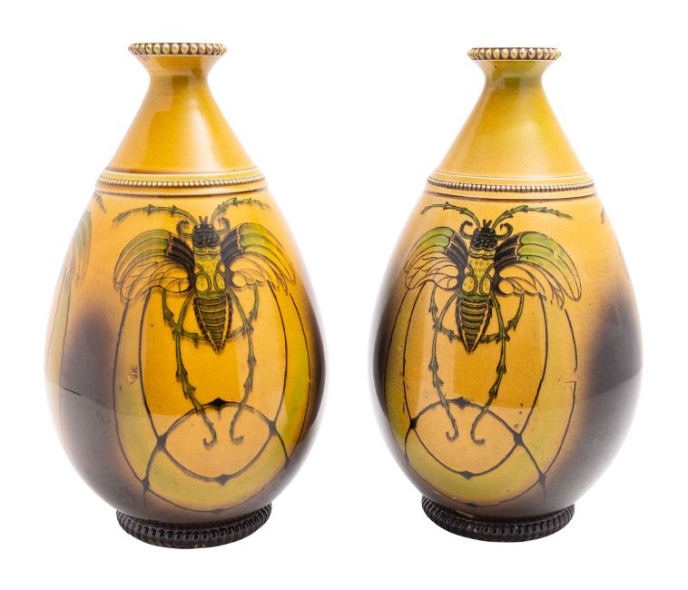 A pair of Thomas Forester pottery vases, of oviform with beaded shoulders and flaring neck printed in the Colorado pattern with a large winged insect on a mustard ground, printed marks, circa 1895, 27cm high, [small rim chip].