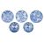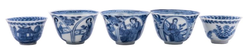 A group of five Chinese toy blue and white teabowls and saucers, Kangxi a pair painted with the 'cuckoo in the house' pattern, butterfly marks within double circles, saucers 6.5cm [damages]; and a matched set of three each painted with foliate panels depicting a lady seated by a fence, lingzhi and prosperity marks within double circles, saucers 8cm [10].