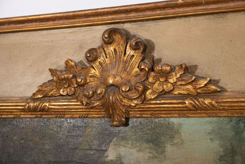 A painted and parcel gilt framed trumeau mirror in Louis XV style, 19th century; rectangular, the inset oil depicting a Watteauesque figural scene, with moulded rocaille foliate cresting, flanked by recessed panels with conforming decorative motifs; the picture and the rectangular plate with acanthus clasped reeded surrounds; 160cm high, 103cm wide