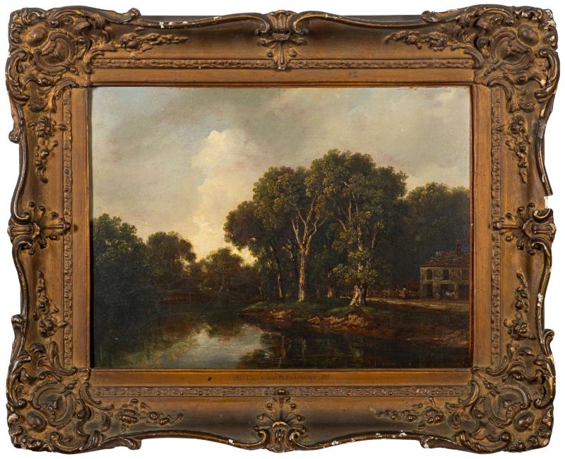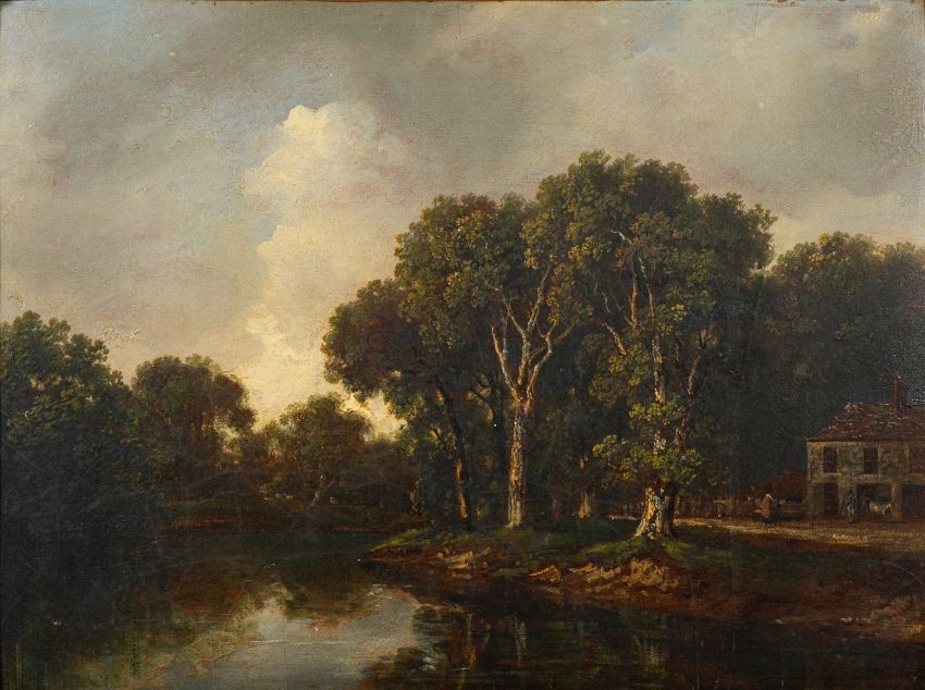 Attributed to Sir George Howland Beaumont (British, 1753-1827) - A river landscape -Oil on board - 29 x 39cm, 44 x 55cm framed - Unsigned, attribution to the frame.