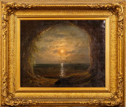 Follower of James Francis Danby (British, 1816-1875) -A view out to a moonlit sea from the mouth of a cave - Oil on canvas - 37.5 x 47.5cm, 60 x 70cm framed - Unsigned, this lot bears similarities to Bonhams sale 28th April 2009, lot 302