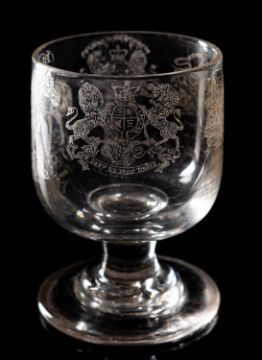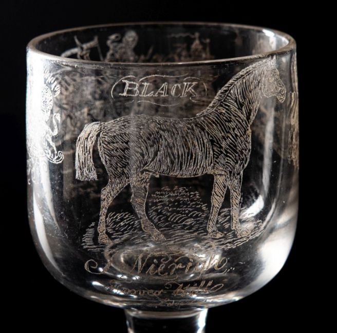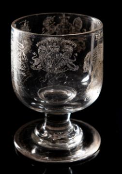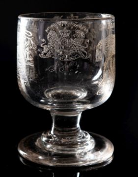 A glass rummer, profusely diamond point engraved with Royal Arms, a love poem, a pony named Black, J. Nierigh, Tower Hill, London, 13cm high.